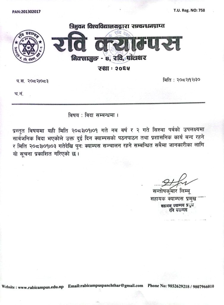 Campus Notice | Students | Teaching Faculties विदा सम्बन्धमा । ByTika Bhattarai August 26, 2025August 26, 2025 प्रस्तुत विषयमा भोलि मिति २०८२/०५/१० गतेका दिन हरितालिका तीज पर्व पर्न गएकोले उक्त दिन महिला विदा हुने ब्यहोरा सम्पुर्ण महिला कर्मचारी, प्राध्यापक एवम् छात्रा विद्यार्थिहरुलाई सुचित गरिन्छ ।